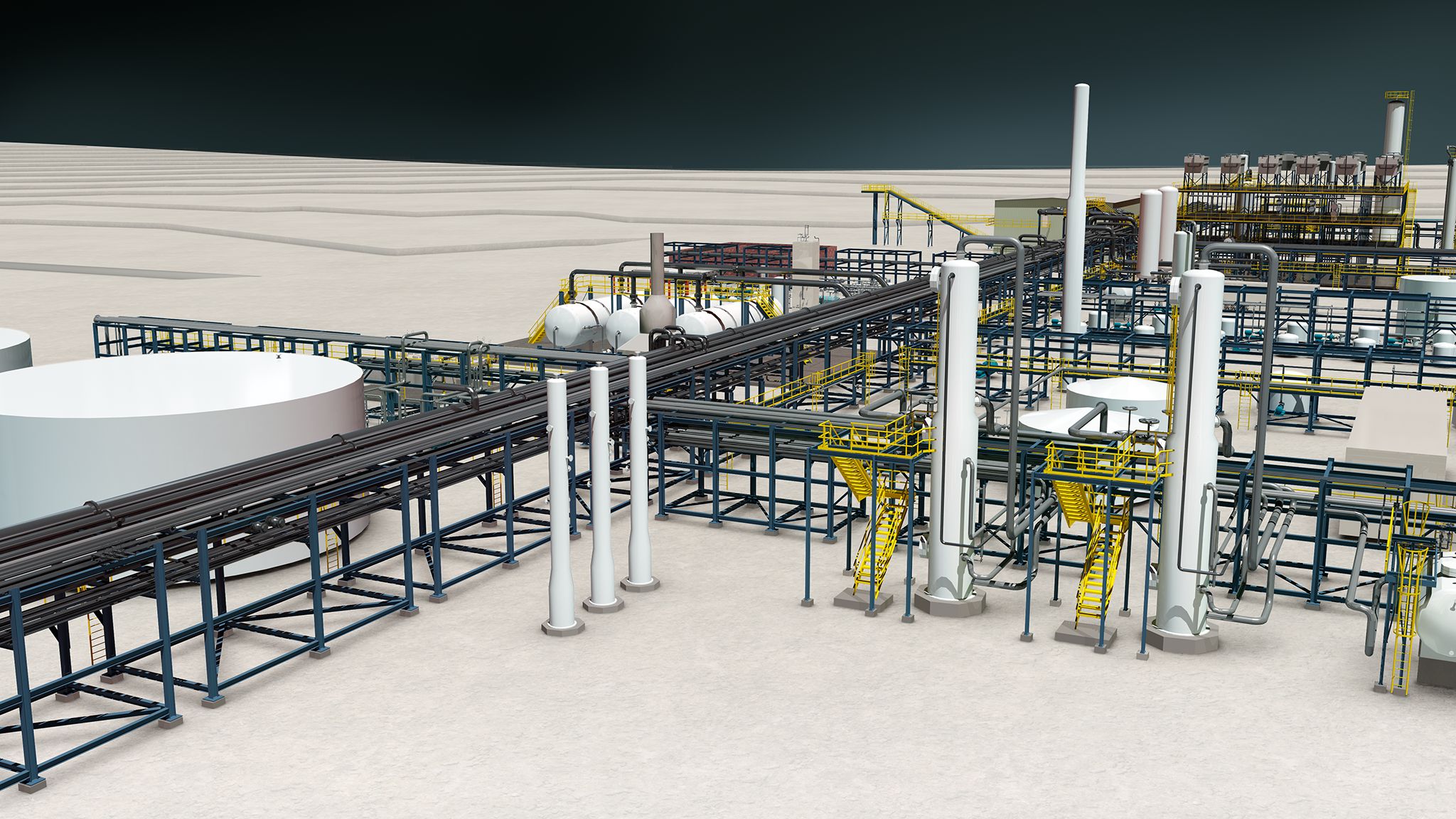 Imagem renderizada de uma refinaria de óleo e gás. Fonte: Autodesk.
